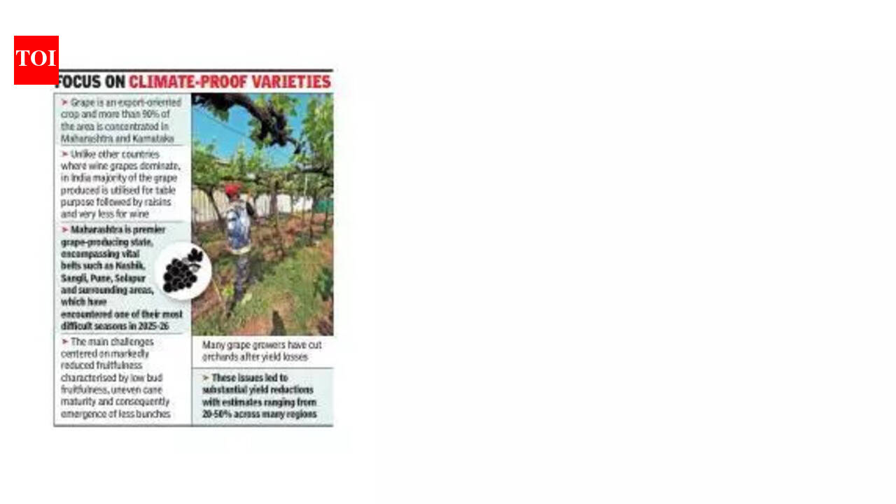 पुणे: महाराष्ट्राची सध्या सुरू असलेली द्राक्ष काढणी कमकुवत पायावर सुरू झाली आहे, उत्पादकांनी उत्पादनात तीव्र घट नोंदवली आहे – अनेक प्रमुख पट्ट्यांमध्ये – 40-45% पर्यंत – गेल्या वर्षी दीर्घकाळ आणि अवकाळी पावसामुळे वाढीच्या गंभीर टप्प्यात द्राक्षांचा विकास विस्कळीत झाला, असे शेतकरी प्रतिनिधींनी सांगितले. नाशिक जिल्ह्यातील काही भागांमध्ये जानेवारीपासून काढणी सुरू झाली असून निर्यातीची वाहतूक सुरू आहे, परंतु मागील हंगामाच्या तुलनेत द्राक्षांची एकूण उपलब्धता लक्षणीयरीत्या कमी आहे. फेब्रुवारी आणि मार्च हे पीक कापणीचे महिने असण्याची अपेक्षा आहे, तरीही एकूण व्हॉल्यूम सामान्यपेक्षा कमी राहण्याची शक्यता आहे, उत्पादकांनी सांगितले. महाराष्ट्र राज्य द्राक्ष उत्पादक संघाचे (नाशिक) अध्यक्ष बाळासाहेब गढक म्हणाले की, कापणी सुरू असताना नुकसान आता स्पष्टपणे दिसत आहे. “कापणीच्या वेळीच परिस्थिती आता स्पष्ट झाली आहे. सामान्य वर्षाच्या तुलनेत उत्पादन सुमारे 40% कमी आहे आणि एवढ्या मोठ्या प्रमाणात नुकसान अनेक वर्षांमध्ये प्रथमच दिसून येत आहे,” ते म्हणाले. गढक यांनी स्पष्ट केले की नुकसानीचे मूळ मागील वर्षीच्या विस्तारित पावसाळ्यात होते, जो लवकर सुरू झाला आणि जवळजवळ सहा महिने चालू राहिला. अतिवृष्टी आणि ढगांच्या आच्छादनामुळे एप्रिलमध्ये फाउंडेशनची छाटणी करण्यात आली, जो अंतर्गत घड निर्मितीसाठी महत्त्वाचा टप्पा आहे. “दीर्घकाळ पाऊस आणि सूर्यप्रकाश नसल्यामुळे घड तयार झाले नाहीत. ऑक्टोबर छाटणीनंतर घड अजिबात निघाले नाहीत,” ते म्हणाले. गढक म्हणाले की, एकट्या नाशिक जिल्ह्यातच अंदाजे २५-३०% द्राक्ष वेली कापल्या गेल्या आहेत कारण शेतकरी नवीन, हवामानास अनुकूल वाणांची पुनर्लागवड करू पाहतात. नॅशनल रिसर्च सेंटर फॉर ग्रेप्स (NRCG), पुणे यांच्या मते, फाउंडेशनच्या छाटणीनंतर प्रतिकूल हवामानामुळे कळ्यांची फळधारणा, असमान ऊस परिपक्वता आणि नाशिक, सांगली, पुणे आणि सोलापूरसह महाराष्ट्रातील द्राक्ष पट्ट्यांमध्ये घड कमी झाला. संस्थेने अनेक क्षेत्रांमध्ये 20% ते 50% पर्यंत उत्पन्न नुकसानीचा अंदाज लावला आहे. सध्याचे बाजार दर स्थिर असताना आणि निर्यात सुरू असताना, कमी प्रमाणामुळे उत्पादकांच्या एकूण परताव्यावर परिणाम झाला आहे. NRCG चे संचालक डॉ कौशिक बॅनर्जी यांनी TOI ला सांगितले: “एप्रिल 2025 मध्ये फाउंडेशनच्या छाटणीनंतर अपवादात्मक प्रतिकूल हवामानात मूळ कारण होते. गेल्या वर्षी मे महिन्याच्या सुरुवातीला पाऊस सुरू झाला आणि तो नेहमीपेक्षा जास्त लांबला, द्राक्ष पिकवणाऱ्या भागात ऑगस्ट आणि सप्टेंबरमध्ये मुसळधार पाऊस पडतो, अनेकदा महिन्यातून 15 दिवसांपेक्षा जास्त पाऊस पडतो. ढगाळ आकाश आणि अधून 